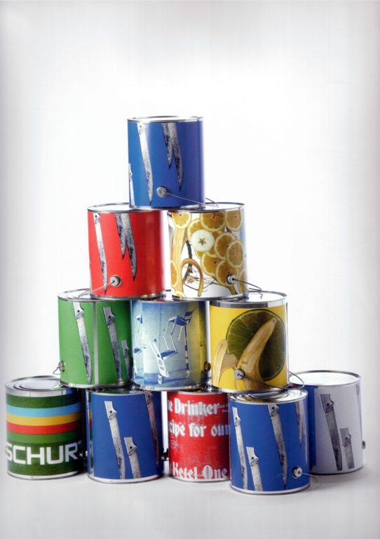 GUYTON\WALKER, Paint Cans (from Dear Ketel One drinker hello again), 2006, Digital inkjet print on paint pots, 12 parts, 76,2 x 83,8 x 38,1 cm