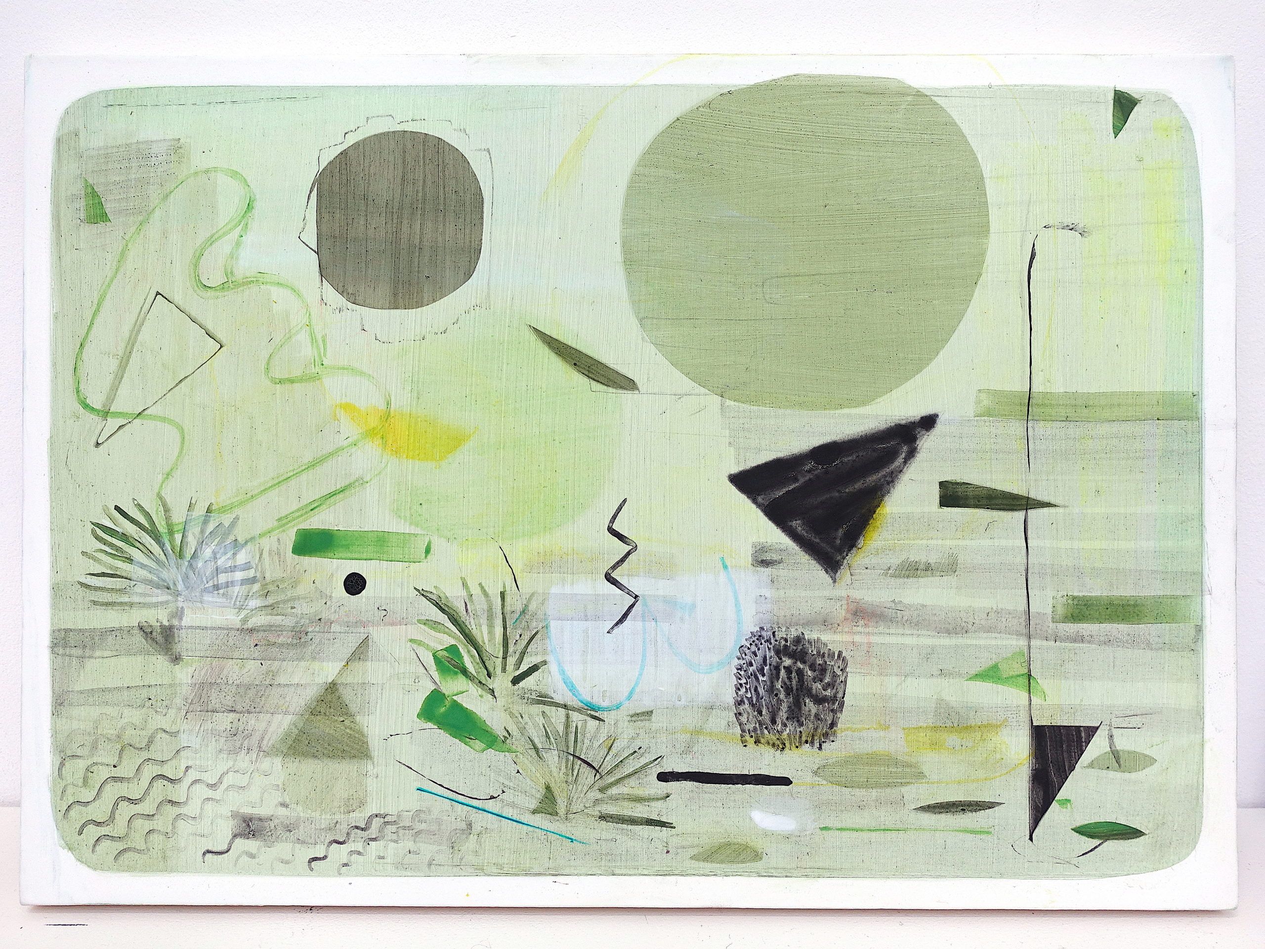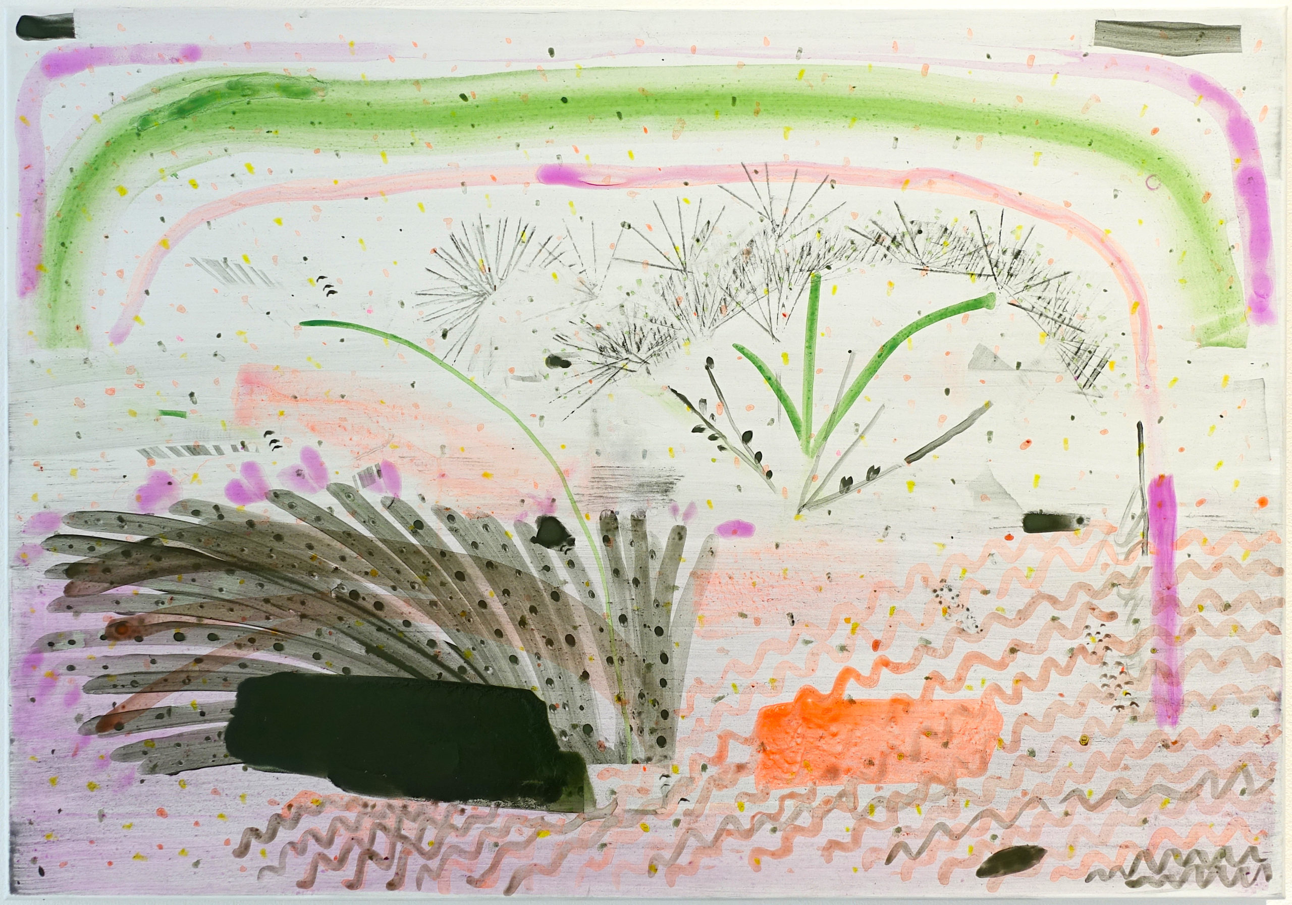 The frame of most of her works opens with a whimsical density in which volumes, curves, and cuts are organically mixed. The colorful planes overlap and sometimes invade the exhibition spaces in vast wall compositions. The tones are fluid, and the images appear attenuated, slightly cooled. The forms seem to immerge from behind the canvas as if Herzig had painted them from the back. The paintings are made of accumulations, games, and collages, giving the audience agency to create a personalized narrative.