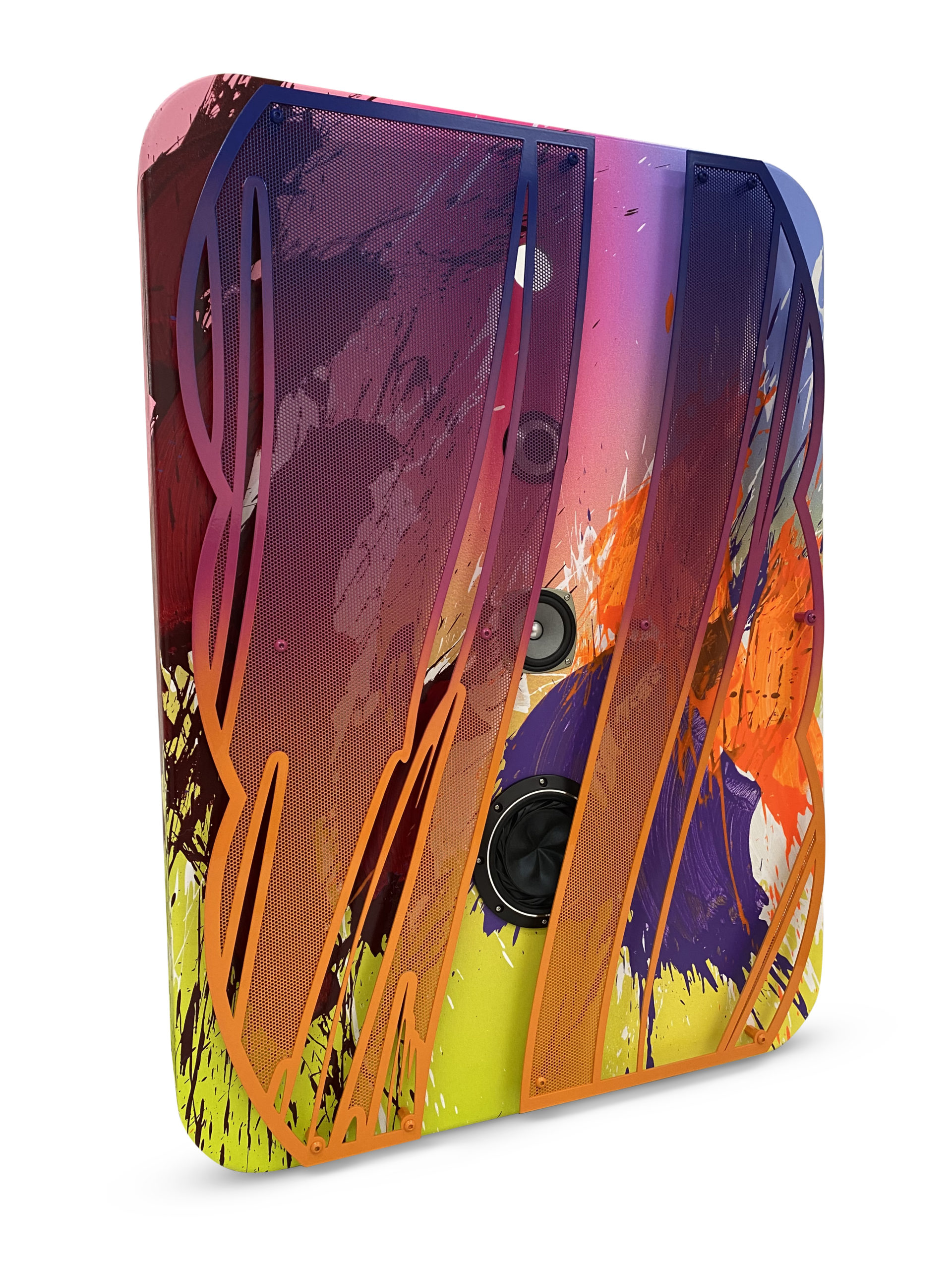 Perforated steel, lasercut steel, carpaint, speakers, plywood, MDF, acrylic, canvas, electronics