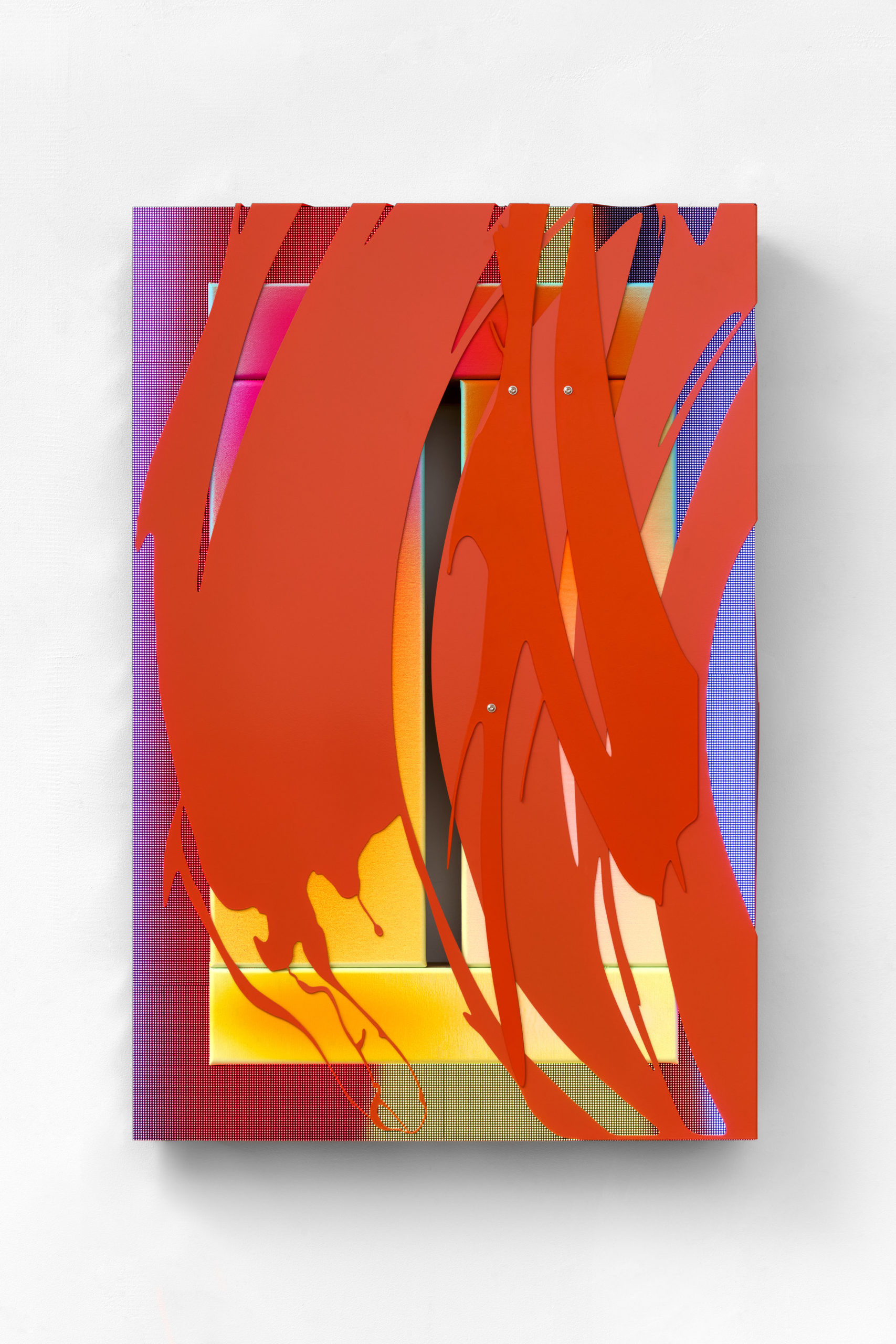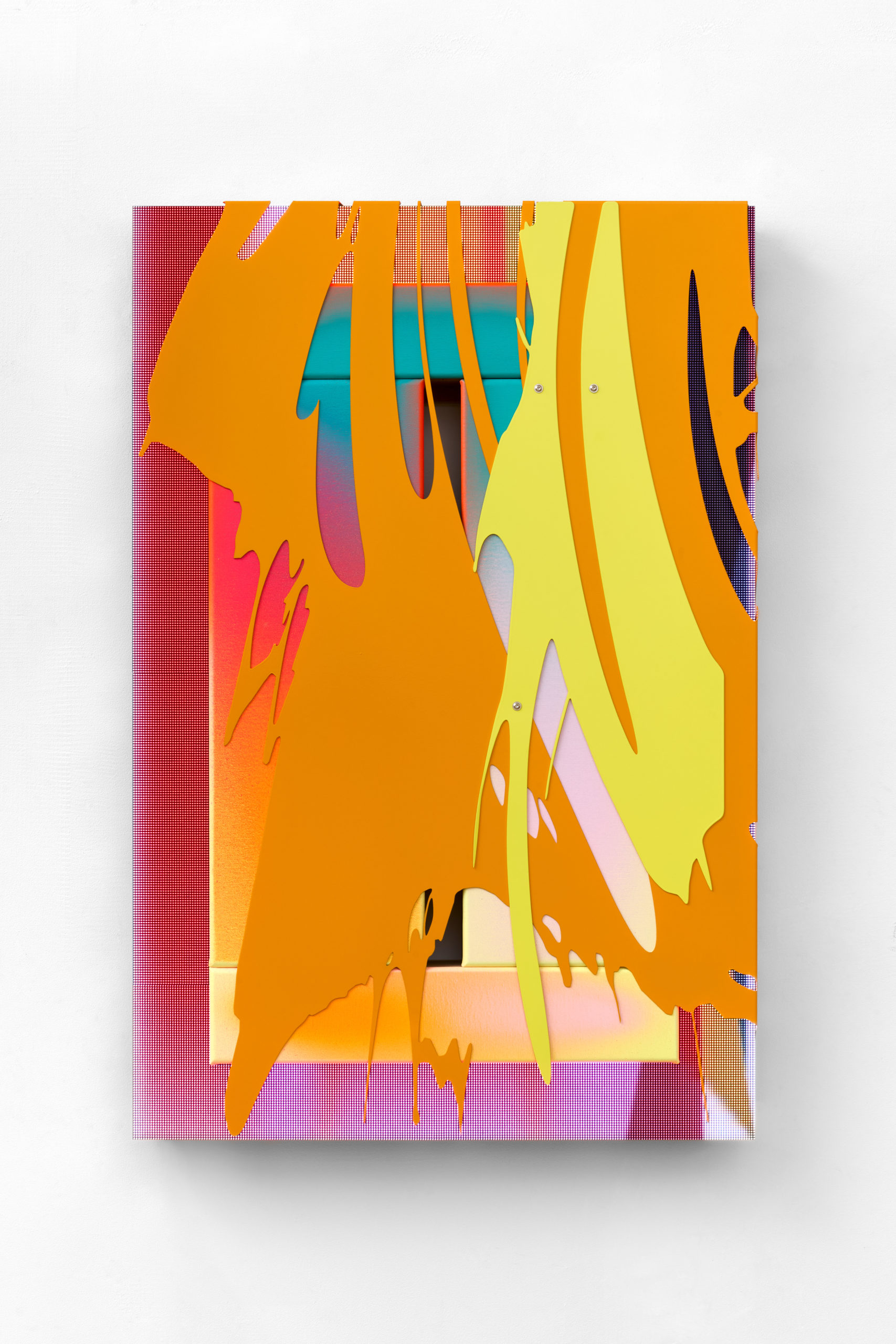 Departing from acrylic-on-canvas compositions, he began adding alien materials to the canvas, expanding more and more into space as a gesture to prolong the rectangular pictorial field beyond its boundaries. Embracing bold neon tones and fluctuating space through the picture plane by means of physical ruptures, he tampers with classical pictorial conventions to prove the prevalence of sensory, emotive and intellectual experiences eventuated by art. His installations and sculptures are multisensory endeavours that supplement his investigation into chromatic fluency with spatial and temporal explorations. Immersed in London’s rave culture, techno communities and club aesthetics, Nemes was stimulated by the cultural counternarratives surrounding him, while continuously referencing great predecessors, such as the Abstract Expressionists, Colour Field painters and representatives of Spatialism.